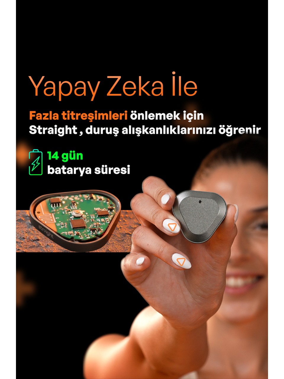 Straight Plus, gelişmiş sensörleri ve yapay zekâ algoritması sayesinde yalnızca kısa süreli hareketleri değil, uzun vadeli duruş alışkanlıklarınızı da analiz eder. Zamanla size özel bir duruş profili oluşturur ve kişisel antrenörünüz gibi davranır.